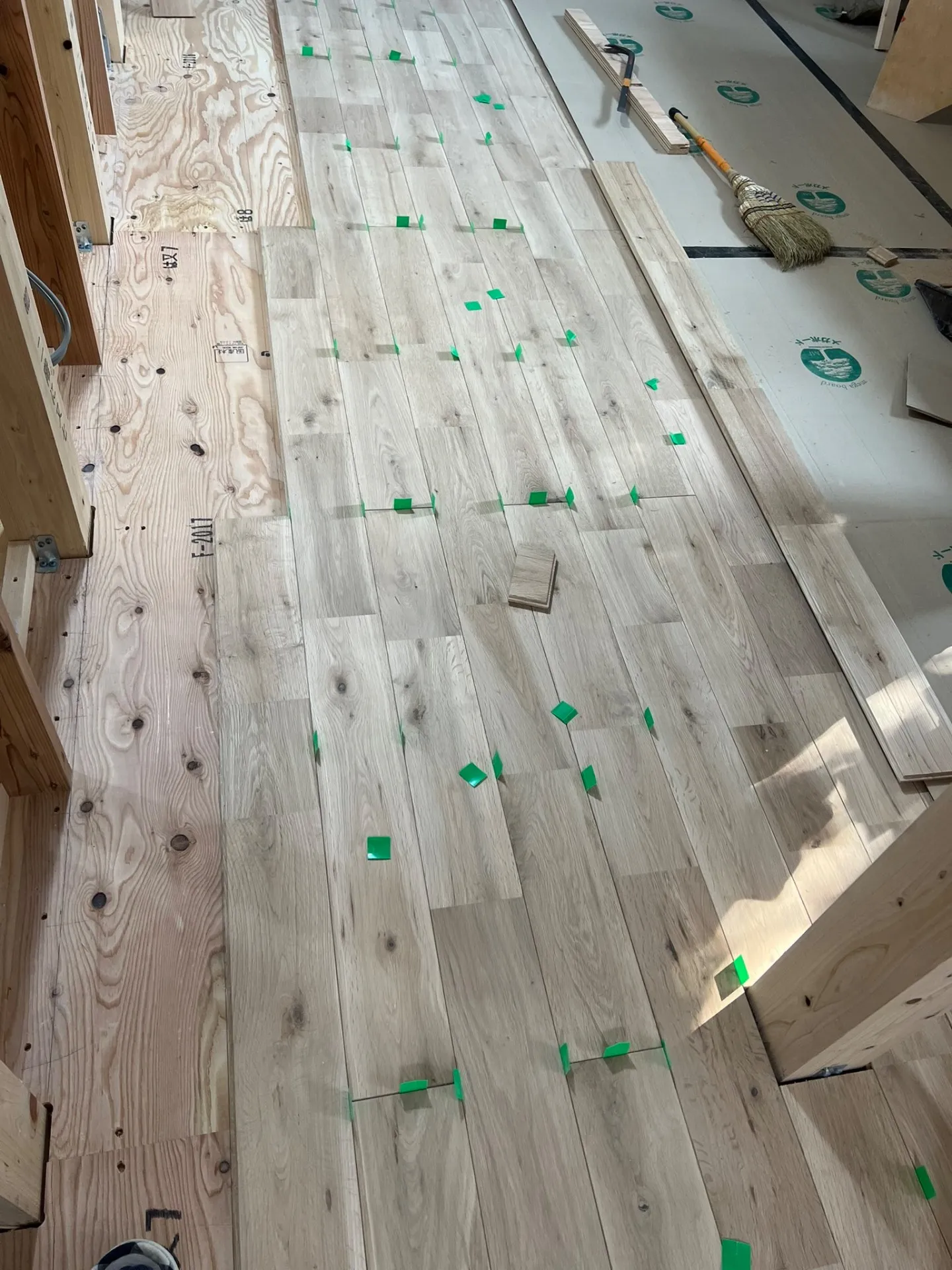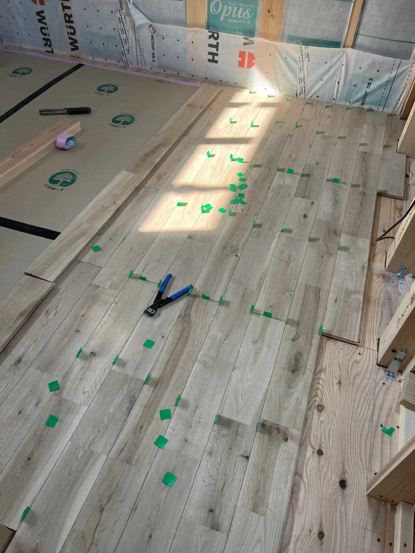断熱工事が終わり、無垢フロアーオーク貼りを進めています。